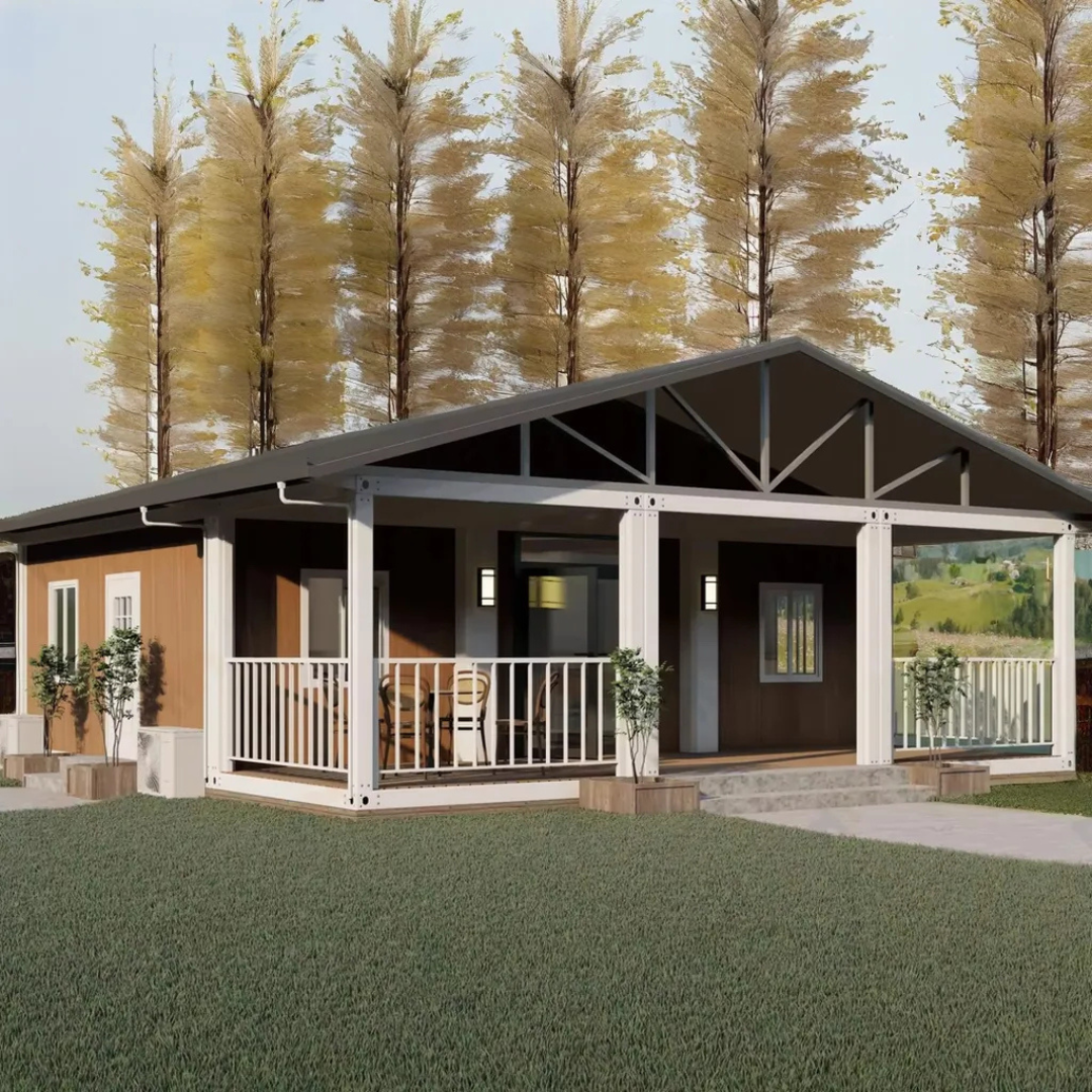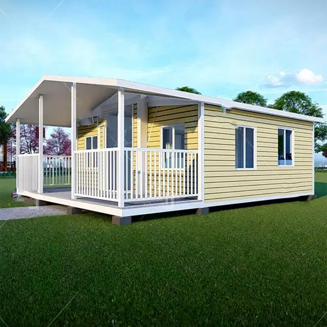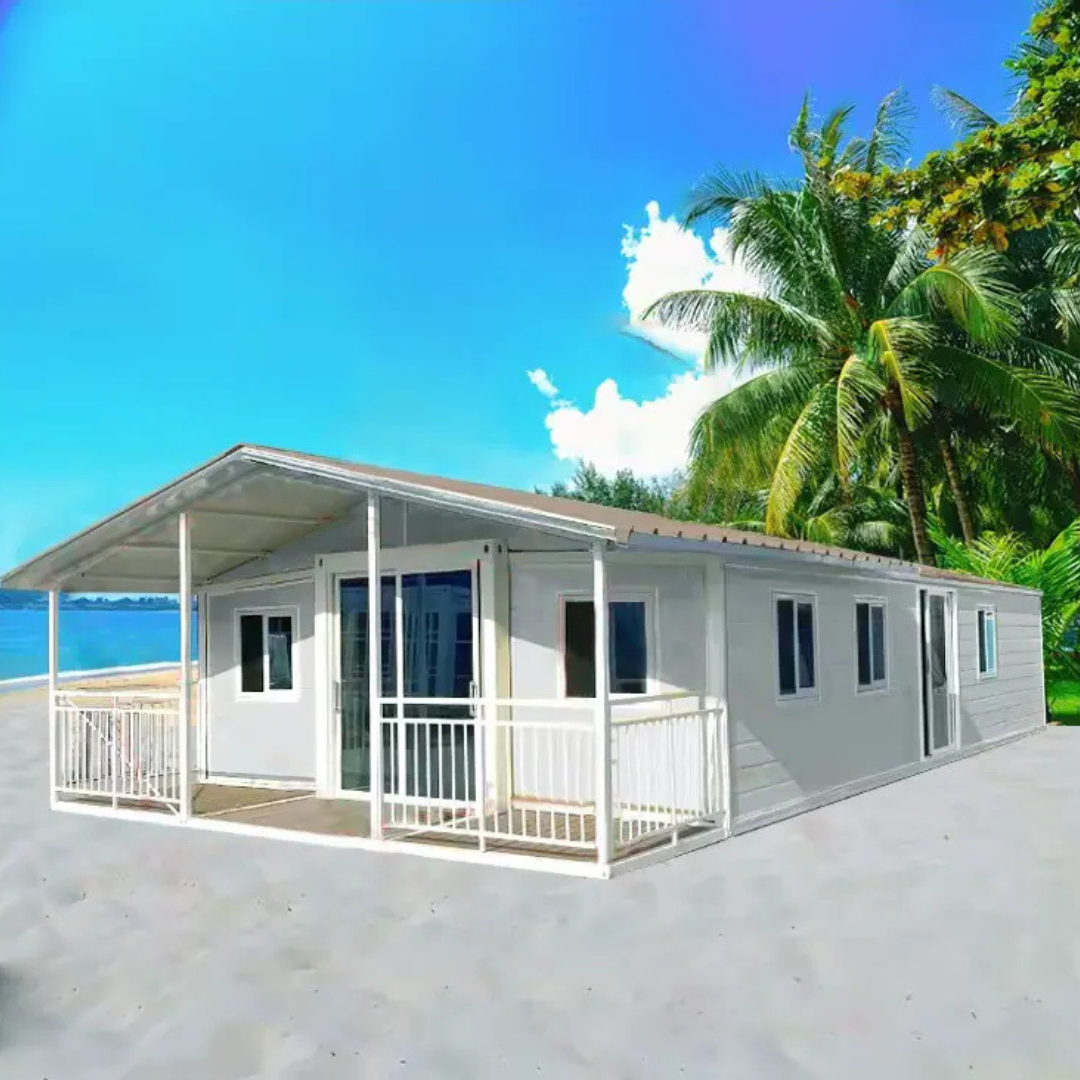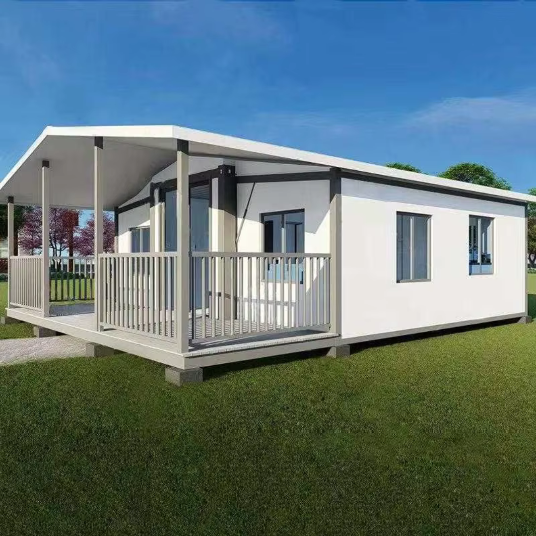This spacious prefabricated mobile home offers an elegant modern living solution. With its contemporary, bright white design, it features a generous covered porch with white railings and an outdoor seating area. The structure boasts large windows that provide abundant natural light and panoramic views of the surrounding environment. This compact prefabricated home combines modern design and functionality in a portable, expandable living solution. With interior dimensions of 20 ft (approximately 37.18 m²) and a 1.5 m × 6.24 m (approximately 9.36 m²) balcony, it offers a total floor area of approximately 46.54 m². It includes well-designed spaces, including an open kitchen, a bathroom, and two bedrooms, making it ideal for a variety of uses, such as residential, hotel, office, or garage. This structure can be customized to suit specific needs and is designed for quick and easy installation.